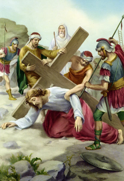 Overwhelmed by the weight of the Cross, Jesus falls again to the ground. But the cruel executioners do not permit Him to rest a moment. With thrusts and blows they urge Him onward. With what cruelty Jesus in treated and trampled under foot! Remember, compassionate soul, that your sins caused Jesus this painful fall.